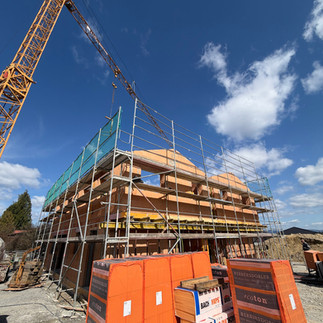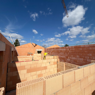 Bei der Hausnummer 17 wurde die Geschossdecken betoniert und die Treppen eingebaut. Im Anschluss wurden die Außenwände sowie die Giebelwände weiter aufgemauert und die Trennwände errichtet.
